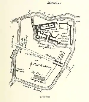 At the time of the Domesday Book Taunton belonged to the Bishop of Winchester, who had a minster or Augustinian Priory on the site. Between 1107 and 1129 William Giffard the Chancellor of King Henry I, converted the bishop's hall into a castle. In 1216, Bishop Peter des Roches, a supporter of King John, defended the castle during a barons' revolt.[5] By the late 12th century the keep measured 65 feet (20 m) by 98 feet (30 m) with a first floor great hall over a stone vaulted undercroft. During the Second Barons' War it was used as a prison for the son of Simon de Montfort who was held here until 1282. In 1451, when the Earl of Devon besieged the castle which was held by Lord Bonville, it was arranged around two baileys.[3]