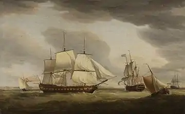 On 28 January 1797 the Indiamen had sailed through the Bali Strait in a squall and were off Java when they encountered six French frigates. Farquharson proceeded to organize a bluff. To give the impression that the convoy consisted of the powerful ships of the line that the Indiamen resembled, Farquharson ordered his ships to advance in line of battle. The French retreated, convinced they were facing a superior force. Actually, the French outgunned the East Indiamen both in terms of the number of guns and the weight of shot per gun.