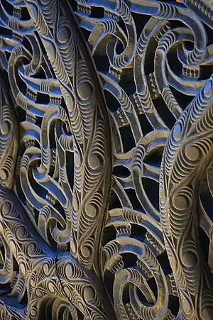 Tāwhaki and his young brother set off to climb up to the sky. At the foot of the ascent they find their grandmother, Whaitiri, now blind, who sits continually counting the tubers of sweet potato or taro that are her only food.[3] Whaitiri is the guardian of the vines that form the pathway into the sky. The brothers tease her by snatching them away, one by one, and upsetting her count. Eventually, they reveal themselves to her and restore her sight. In return, she gives them advice about how best to make the climb into the sky. Karihi tries first, but makes the error of climbing up the aka taepa, or hanging vine. He is blown violently around by the winds of heaven, and falls to his death. Tāwhaki climbs by the aka matua, or parent vine, recites the right incantations, and reaches the highest of the 10 heavens. There he learns many spells from Tama-i-waho, and marries a woman named Hāpai, or as others say, Tangotango or Maikuku-makaka. They have a son, and according to some versions of the story it is this child who is named Wahieroa (Biggs 1966:450).[4]