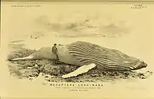 There were snow showers, but Struthers was able to remove much of the skeleton before Woods had the flesh embalmed; the carcass was then stuffed and sewn up to be taken on a profitable tour as far as Edinburgh and London. Finally on 7 August 1884 Struthers was able to remove the skull and the rest of the skeleton. Struthers eventually wrote seven anatomy articles over the next decade on the whale, and ultimately published a complete monograph on it in 1889, entitled Memoir on the Anatomy of the Humpback Whale, Megaptera Longimana.[1]