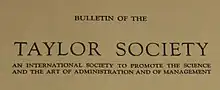 - ↑ Bulletin of the Taylor Society. Volume 1, No 1, Dec. 1914. p. 1; And: Volume 2, No 5, Dec. 1916. p. 1