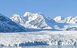 Tazcol Peak is a 7,850-foot-elevation (2,393-meter) mountain summit located 18 miles (29 km) north-northwest of Valdez in the U.S. state of Alaska. This remote glaciated mountain is set in the Chugach Mountains on land managed by Chugach National Forest.[1] Precipitation runoff from the mountain drains south to Prince William Sound and north to Tazlina Lake → Tazlina River → Copper River. Topographic relief is significant as the summit rises 4,350 feet (1,326 m) above the East Branch of the Columbia Glacier in 1.4 mile (2.25 km). The peak's name was applied in 1959 by mountaineer and glaciologist Lawrence E. Nielsen (1917–1992), and the toponym was officially adopted in 1965 by the U.S. Board on Geographic Names.[3][4] The word "Tazcol" is a portmanteau blending the names of the Tazlina Glacier and Columbia Glacier which flow from this mountain's north and south slopes respectively.[5]