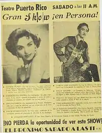 During the Christmas season, shows featuring la música jíbara were offered. The Teatro also presented a children's talent show called Fiesta Infantil con Joaquín Santiago directed by the theater's MC, in which parents were encouraged to bring their children as participants.[10] In the winter of 1953, Ramón "Diplo" Rivero and his troupe traveled to New York City to perform before the Puerto Rican community and for three weeks Rivero and his show "El Tremendo Hotel" held sell out performances at the teatro.[11]
