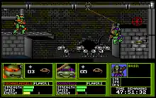 The goal of the game is to complete a number of missions, consisting of levels divided into screens, culminating in a final battle with The Shredder. The gameplay is similar to the original Prince of Persia, as characters switch between free movement and melee fighting stances in a two-dimensional platformer environment.[2] In between missions the Turtles can rest, regaining lost hit points, but the player only has a limited amount of time in which to find the Shredder. The game is designed to be played with a keyboard, and utilizes a key to switch between walking and fighting modes. Each Turtle has the ability to arm and withdraw his weapon. Each Turtle wields his signature weapon and a number of shuriken. Holding the enter key makes the Turtles attack, and the spacebar is used to block enemy attacks based on which arrow key is held.