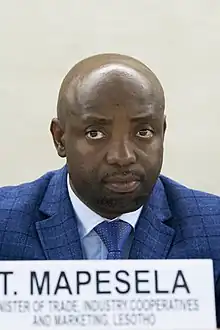 Tefo Mapesela (born 25 April 1974) is a Mosotho accountant and politician who serves as the leader of the Basotho Patriotic Party. He has been a proportional representation member of the National Assembly since April 2023, after previously serving as the legislator for Mokhotlong No. 79 constituency from 2015 until 2022. A former member of the All Basotho Convention, Mapesela served as the Minister of Trade and Industry from 2017 until 2018, as the Minister of Defence and National Security from 2018 to 2020 and as the Minister of Agriculture and Food Security between 2020 and 2021.