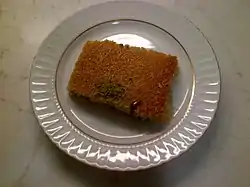 Tel kadayıf (Turkish: Tel kadayıf) is a Turkish dessert commonly served during the month of Ramadan. Kadayıf noodles are used in making tel kadayıf. It is baked in the oven after nuts such as peanuts or walnuts are placed between the layers of kadayıf noodles. It is served by pouring a sugary syrup on it.