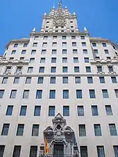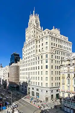 Its construction started in 1926 and it was fully completed in March 1929, despite opening its doors officially on 1 January 1930.[3] The workforce was composed of more than 1000 workers and the final cost added up to 32 million pesetas. It became one of the first skyscrapers in Europe.[4] It also held the Madrid height record by surpassing the Palacio de la Prensa, which it maintained until it was overtaken in 1953 by the Edificio España.[5]