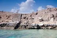 Telegraph Island is situated in a fjord at the northern end of the Musandam Peninsula, which forms part of the Oman mountain range described by the geologist George Martin Lees as "projecting like a spur into the vitals of Persia" (today's Iran).[2] Being part of the edge of the Arabian tectonic plate, the rock stata are subjected to massive pressure as the plate subducts beneath the Eurasian plate. The result is that Musandam is being pushed downwards at approximately 6 mm (0.24 in) per year at its northernmost point, with spectacular results.[3] Fresh-water springs that once flowed over the land may have become submerged, possibly giving rise to stories of sailors diving into the sea to collect fresh water in leather bags.[4]