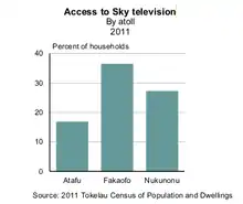 In the 2011 census, it was found that a similar percentage of households on each of Tokelau's atolls owned televisions, with figures ranging between 64.9% and 67.9%. However, as of 2011, less than 50% of all households in Tokelau hold a subscription to the service.[1]