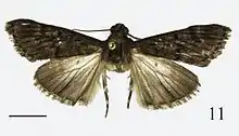 The wingspan is 30โ€“35 mm.[1] The species has two forms: a blackish form and the whitish from. The blackish form can be differentiated by the forewing and the distal two-thirds of the hindwings which are blackish brown. The whitish form is similar to Teliphasa albifusa superficially.