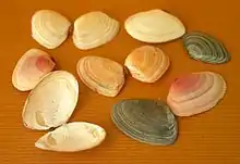 Bivalves are molluscs with a body compressed between two usually similar shell valves joined by an elastic ligament. There are teeth at the edge of the shell and the animal has a muscular foot, gills, siphons, mouth and gut and is surrounded by a mantle inside the shell.