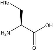 Tellurocysteine (in some publications referred to as Te-Cys) is an amino acid with the formula HTeCH2CH(NH2)CO2H. It would be the heavy analogue of serine, cysteine, and selenocysteine. Tellurol (RTeH) is a rare and fragile functional group, especially alkyl derivatives. Furthermore the C-Te bond (200 kJ/mol) is weak compared to 234 kJ/mol for the C-Se bond.[1] These factors combine to make tellurocysteine very labile. Even selenocysteine occurs only rarely in nature.[2] Instead of tellurocysteine, tellurocystine is generally isolated instead. It has the formula (TeCH2CH(NH2)CO2H)2, with a central Te-Te bond.[3]