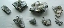A variety of iron, copper, arsenic and zinc ores such as arsenopyrite, pyrrhotite, pyrite and chalcopyrite with sphalerite, are present as small veins and in quartz veins throughout north-trending shear zones that cut the iron-rich tholeiitic basalts of the Arsenic Lake Formation. Dikes composed of quartz-feldspar porphyry run parallel to or lie within the shear zones and are cut by the mineralization. Chalcopyrite occupies later fractures which intersect massive arsenopyrite. Sparse quartz veins normally exist in or adjacent to the arsenopyrite-rich zones. Several northeast-trending deformation zones intersect pyroxenite of a mafic sill in northwest Strathy Township. Within these high-strain zones quartz veins normally contain chalcopyrite, pyrite, pyrrhotite with exsolved pentlandite and traces of sphalerite and galena. Chalcopyrite, pyrrhotite and pentlandite are deposited throughout shear zones which lack quartz veining. These zones are not known to contain large amounts of gold, although investigations are incomplete. It is also unknown if platinum group metals (which include platinum, palladium, rhodium, iridium, osmium and ruthenium) exist in these zones because no searches for platinum group elements have been undertaken.[9]