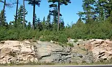 Many north-trending shear zones intersect iron-rich tholeiitic basalts of the Arsenic Lake Formation. These zones range in width from less than 1 m (3.3 ft) up to 5 m (16 ft), and might maintain a larger area of weakness that was tectonically active over the past billion years. Evidence for early tectonism, likely related to volcanic activity, include the greater density of felsic dikes concentrated immediately around these zones. An example is the north–south trending Big Dan Shear Zone situated near the former garbage dump of Temagami. The felsic dikes near this zone are interpreted to represent a subvolcanic feeder system to the overlying felsic volcanic rocks. It is probable that the dikes maintained a former zone of weakness now demonstrated by the shear zones. Renewed tectonic activity along the Big Dan Shear Zone is manifested by offset of clastic sediments east of the Ontario Northland Railway. This phase of tectonic activity displaced felsic dikes north of the exposed part of this shear zone. However, considerable displacement of the dikes at this location is unknown. The most recent phase of tectonic activity along the Big Dan Shear Zone resulted in the displacement of a Proterozoic dike composed of diabase, which intersects the zone. A similar abundance of felsic dikes are adjacent to Arsenic Lake just west of Highway 11, indicating similar repetitive tectonism also occurred along that structural zone. Therefore, the north-trending shear zones may have been active for at least a billion years.[9]