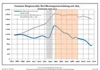 Development of population since 1875 within the current boundaries (Blue line: Population; Dotted line: Comparison to population development of Brandenburg state; Grey background: Time of Nazi rule; Red background: Time of communist rule)