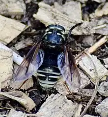 Temnostoma venustum (Williston, 1887), the Black-banded Falsehorn , is a rare species of syrphid fly observed in the northeastern United States and adjacent Canada. Hoverflies can remain nearly motionless in flight. The adults are also known as flower flies for they are commonly found on flowers, from which they get both energy-giving nectar and protein rich pollen. Temnostoma adults are strong wasp mimics The larvae burrow in moist decayed wood.[3][4]