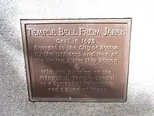 Temple Bell, also known as Japanese Temple Bell, is a bell and bronze sculpture by Suzuki Magoemon, installed in Boston's Back Bay Fens, in the U.S. state of Massachusetts. Cast in 1675, the bell was originally installed in Manpukuji Temple, in Sendai, Japan, before being salvaged by USS Boston sailors. It was presented to the City of Boston by the sailors in 1945, before being officially presented by Japan as a symbol of peace in 1953. The bell was also previously installed in Boston Common.[1]