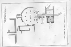 Hope appears to have identified part of the precinct wall to the west of the church as that which was authorised by the 1306 licence to crenellate, which referred to a certain part and strong gate and which was noted in the 1338 Extent as a curtilagio. He also discovered a number of slight structures the south wall of the precinct, which were probably the henhouse and stables mentioned in the Extent. A larger building lay to the south of the church. This was 36m long and 11.5m wide, and was probably a barn. Hope was able to distinguish four phases of the development of the Preceptory. The first phase was the church with a round nave, about 15m in diameter, with a ring of eight columns, which distinguished a central area from an outer aisle. To the east was a rectangular presbytery of two bays measuring about 8m by 4m, with an apse at the east end. Below this lay a crypt, which may be the feature shown in the bottom left-hand corner of Samuel Buck 1726 engraving of the Preceptory. No clear indication was found of the fenestration except at the east end of the apse; and there was no clear point of access to the nave, though this may have lain on the north side where outside several rock cut graves into the local limestone, were recorded. This first phase appears to equate with the initial foundation of the Preceptory in the mid-12th century.