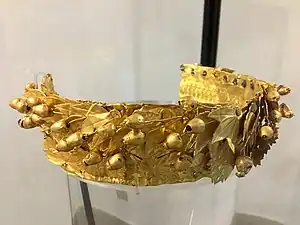 The oldest (imported) ceramic finds from the 8th century suggest that the area of the Lacinio promontory was a place of worship even before the arrival of the Greek colonists, but are not significant for evidence of Greek visits prior to the colonial phase.[1] These finds from the first cult area were below "Building B" which dates from the early 6th century BC as testified by the rich votive offerings including masterpieces in gold, silver and bronze.[2] The most important building of the sanctuary later became the large Doric temple (A), built on a different alignment near the edge of the cliff around 480-470 BC on top of a previous archaic temple from the 7th century.