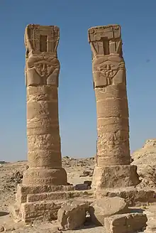 Restoring a ruined structure abandoned by New Kingdom pharaohs, named B300-sub, Taharqa built an outer temple of cut stone masonry comprising entrance kiosk, pylon, Bes pillars, columns topped with sistrum-headed Hathor capitals and carved five wall painted chambers into the rock base to honor the goddess Mut, who believed to dwell together with the state-god Amun inside Jebel Barkal.[2] From the outer structure only two of the Hathor columns still survive, but the rock-cut chambers are in good shape and were cleaned and restored from 2015 to 2018.[3]