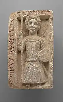 Various reliefs and sculptures come from the temple. A rectangular stele shows the god Arsu. According to the dedication inscription in Palmyrian, the stele was made by the sculptor Oga.[3] Various statues of Heracles were also found in the sanctuary. This seems to indicate that a number of deities and not just Zeus Megistus were worshiped here. Perhaps important members of wealthy families even had individual, private chapels here that only they were allowed to enter.[4]