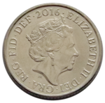 To date, four different obverses have been used. In all cases, the inscription until 2015 was ELIZABETH II D.G.REG.F.D.,[5] followed by the year of minting. In the original design both sides of the coin are encircled by dots, a common feature on coins, known as beading.