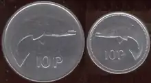 The ten pence (10p) (Irish: deich pingin) coin was a subdivision of the Irish pound. It was used in the Republic of Ireland from 1969 to 2002,[1] with its last minting issue in 2000. It replaced the florin coin, of which it shared its design. Two different designs of the coin exist, both featuring a salmon on the reverse. The second was introduced in 1993 and is smaller, due to the reduction of the coin's value by inflation.