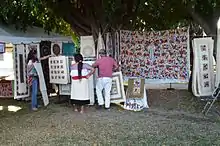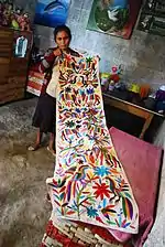 The embroidery is a simplified version of embroidery done for centuries, adapted for products to be sold to the outside world.[4] Pieces generally have multiple figurative elements in stylized form, which are arranged onto the fabric in a geometric pattern, mostly or completely symmetrical.[2][6] The most common elements are the flora and fauna found in the Tenango de Doria area including chickens, dogs, wild birds, rabbits, horses, flowers and trees. Sometimes people and other objects appear as well.[6][7][8][9] Other figures include figures from amate paper cut-outs made by local shamans/healers and prehistoric paintings found in local caves.[5][7] These elements are most often arranged in a pattern, but can be set up for form scenes from daily life, folk festival and religion.[9] The most common background fabric colors are white and off-white, generally for tablecloths and the like, followed by black, but other colors such as reds and blues are used as well.[6] Most often, the elements are not done in realistic colors, rather using bright colors such as yellows, greens and blues. All elements may be of a single color, or multicolored. If the latter, the colors are most often combined as a series of stripes over the elements.[6][8] Better tenangos have small, tight stitches, with a well-done tablecloth or bedspread taking up to six years to make.[6]