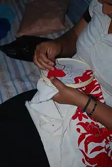 The embroidery style now known as tenango is based on traditional Otomi embroidery of the area, but modified to create pieces to sell. This occurred in the 1960s when a regional drought severely disrupted the local economy's dependence on subsistence agriculture. The origin of this innovation has been traced to the small community of San Nicolas in the municipality of Tenango de Doria. Originally the idea was to make and sell pepenado blouses, a kind of gathered and traditional blouse still worn here. However, these are very time-consuming to make and could not be sold for a sufficient price.[4][5] Instead, embroidery elements were transferred to flat pieces of fabric. Even those sold for very little, especially at the beginning when the style was unknown.[4] Over time, the embroidery style has been applied to tablecloths, napkins, pillow cases, bedspread, various styles of clothing and more.[8] While the work is still primarily done by women, men have taken it up, not only in Tenango but in prison handcraft programs as well.[5][6][7]