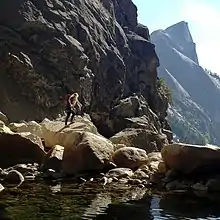 The canyon has no foot trail and is notoriously difficult to navigate due to its steep and polished sides,[1] particularly in spring and summer when water levels are high, Signs warn against hiking in the canyon. The American Canyoneering Association gives Tenaya Canyon a rating of 3B V. The 3 is an "intermediate" rating on a scale of 1 to 4, with 4 most difficult; B is a measure of water volume on a scale of A to C; and the V indicates that the trip will take one and a half days.