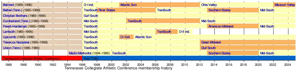 The TCAC was created in 1985 from the western division of the old Volunteer State Athletic Conference. The charter members were Belmont University, Bethel College, Christian Brothers University, Cumberland University, David Lipscomb University, Freed–Hardeman University, Lambuth University, Martin Methodist College, Trevecca Nazarene University, and Union University. The TCAC survived in that form until 1995 when both Belmont and Christian Brothers announced their intentions to go to the NCAA. The remaining teams formed a new conference, the TranSouth Athletic Conference which existed until the 2012-2013 school year.