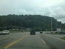 SR 394 begins at an intersection with US 11W (SR 1) in unincorporated northern Sullivan County, heading southeast as a two-lane undivided road that is a secondary state route. The road winds through hilly areas of fields and woods with a few homes. Farther southeast, the route enters Blountville, where it widens to a four-lane divided highway and comes to an interchange with I-81. At this interchange, SR 394 becomes a primary state route. After I-81, the road passes a few businesses and becomes a five-lane road with a center left-turn lane, running through farm fields and woodland. The route curves south and comes to a junction with SR 126 in an commercial area to the west of downtown Blountville. Past here, SR 394 leaves Blountville and winds south through wooded mountains, turning to the east. The road runs through a retail area before it passes more woods and fields with some nearby development. The route heads past a mix of residential development and farmland before it passes southwest of the former Exide Technologies and turns to the southeast. SR 394 runs through an area of woods before it passes through fields. Farther along, the route passes through residential areas with some businesses. The road curves east and comes to an interchange with US 11E/US 19 (SR 34) to the south of Bristol.[1][2]