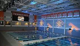 The Tennessee Volunteers men's Swimming and Diving program represents the University of Tennessee located in Knoxville, Tennessee. The Volunteers are currently coached by Matt Kredich.[2] The Vols host their swim meets in the Allan Jones Intercollegiate Aquatic Center which was newly built in 2008.[3] The Vols compete in the SEC where they have won 10 SEC team titles, 173 individual titles and 45 relay crowns. Over the past 75 years of competition the Vols have produced numerous All-Americans, 24 Olympians, scored in 53 consecutive NCAA Championship meets, won 45 individual NCAA titles and won 1 NCAA National Title.
