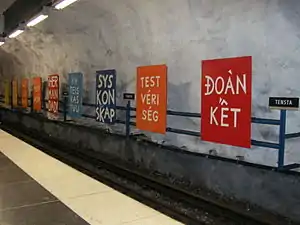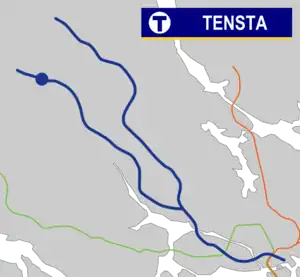 Tensta metro station is a station on the blue line of the Stockholm metro, located in the district of Tensta. The station was opened on 31 August 1975 as part the first stretch of the Blue Line between T-Centralen and Hjulsta. The trains were running via Hallonbergen and Rinkeby.[2] The distance to Kungsträdgården is 13.5 km (8.4 mi).