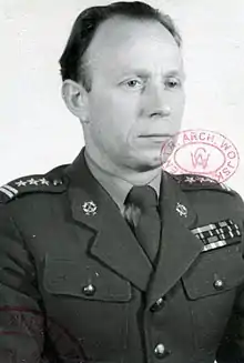 From February 1945 he was an officer in the Citizens' Militia. From 1954 he was an officer of the Ministry of Public Security.[6] From 1954 to 1955 he was a student of the KGB school in Moscow.[6] In 1958 he passed as a colonel to military counterintelligence being part of the Internal Military Service. From 1964 he was the head of this formation. In October 1965, by resolution of the Polish Council of State, he was promoted to the rank of brigadier general. He was nominated in Belweder by Edward Ochab.