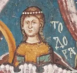 Teodora Nemanjić (Serbian Cyrillic: Теодора Немањић; 1330 – after 1381) was the despotess of Kumanovo as the wife of Despot Dejan (fl. 1355). She was the daughter of King Stefan Dečanski and her eldest half-brother was Serbian emperor, Stefan Dušan. She was the mother of two sons, Constantine Dragaš and Jovan Dragaš, and one daughter. She later became a nun adopting the name Evdokija (Евдокија, gr. Eudokia), hence she is known in historiography as Teodora-Evdokija (Теодора-Евдокија).