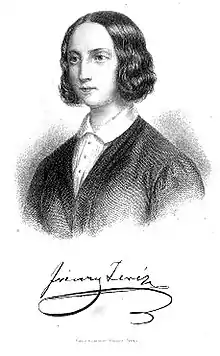 Lajos Ferenczy, a trainee priest, seems to have been the sibling to whom Teréz was closest. One source describes him as "her confidant, comforter and support in her disappointments and loneliness" ("...a bizalmasa, csalódásaiban, magányosságában vigasztalója, segítője").[3] Lajos, however, took up arms in the freedom struggle[lower-alpha 2] and was killed on 20 June 1849.[3] His memory is preserved in his sister's poem "Ó ne kérdjétek" (loosely, "Do not ask").[3] The loss exacerbated Teréz Ferenczy's tendency to melancholy.[4] It was only in 1853, which would be the year of her death, that her poems began to appear in newspapers and journals.[4] At least one source notes that suicide already ran in the Ferenczy family, and on 22 May 1853 driven, it is reported, by disappointment in love and continuing grieving over her brother's death, Teréz Ferenczy shot herself in the heart.[2] As the pathologist's report points out without sentiment, she narrowly avoided the main chambers of her heart, but nevertheless succeeded in killing herself.[2] Reports of her death led to a surge of interest in her poetry, with the first of several collections published in 1854.[5]