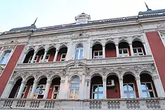 - Hotel Balkan (1935); right across the Hotel Moskva; originally a one-story building built in 1860 on the location of the Simina Kafana, opened by Sima Mehandžija in 1848.[12] It was demolished in 1935 when the present building of the hotel was constructed, work of architect Aleksandar Janković;[30] The old building was also known as the Simina mehana ("Sima's meyhane") and was the gathering point for the volunteers during the Serbian-Turkish wars;[15] Singer Zdravko Čolić recorded a song about the hotel in 2000;[30][65]