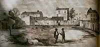 Enraged at his discovery, Sickles confronted his wife. Although she initially denied everything, Teresa eventually wrote a confession.[14] Teresa described her numerous rendezvous with Key at a rented house on 15th Street. A few days later, on Sunday, February 27, 1859, Sickles saw Key outside his house, located on the west side of today's Lafayette Square, signaling Teresa with a handkerchief. Key continued walking, and Sickles sent an acquaintance outside to delay him. Sickles armed himself with several pistols, and intercepted Key at the corner of Madison Place N.W. and Pennsylvania Avenue, across the street from the White House. There, Sickles shot the unarmed Key twice, one shot directed at Key's groin.[15] Key died about an hour later in a nearby house.