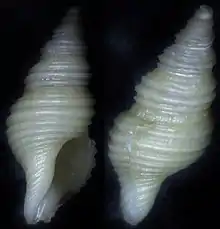 Shell up to 12 mm high, fusiform with acute spire and body whorl occupying about 60% of the total height. Protoconch small, with 4 convex whorls and a sculpture of oblique threads forming a delicate reticulate pattern. Teleoconch with a sculpture of regular, high spiral cords; there are three cords on the first teleoconch whorl and the number increases by intercalation of additional cords in the later whorls. Interspaces of cord filled wit delicate raised lines, parallel to growth lines. Body whorl markedly constricted around the siphonal canal. Aperture lanceolate, with outer lip simple and fragile, curved in lateral view and forming a very deep notch immediately beneath the suture. Protoconch dark brown, teleoconch beige, sometimes with darker suubsutural blotches or flames.[2]