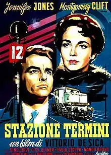Terminal Station (Italian: Stazione Termini, released in the United States as Indiscretion of an American Wife)[3] is a 1953 romantic drama film directed and produced by Vittorio De Sica and starring Jennifer Jones, Montgomery Clift, and Richard Beymer (credited as "Dick Beymer") in his debut role. It tells the story of the love affair between a married American woman and an Italian intellectual. The title refers to the Roma Termini railway station in Rome, where the film takes place. The film was entered into the 1953 Cannes Film Festival.[4]