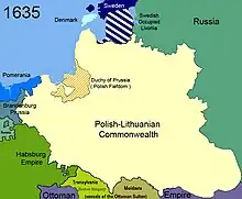 Sweden, weakened by involvement in the Thirty Years' War, agreed to sign the Armistice of Stuhmsdorf (also known as Treaty of Sztumska Wieś or Treaty of Stuhmsdorf) in 1635, favourable to the Polish–Lithuanian Commonwealth in terms of territorial concessions.[41]