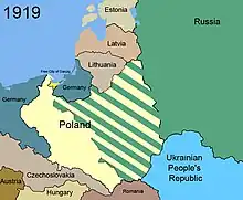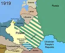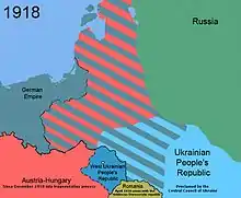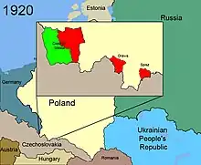 July 28, 1920, Allied ambassadors decision partitioning Cieszyn, Silesia, and leaving in Czechoslovakia a quarter of a million Poles in the strategic Moravian Gate...(leading to Poland from south-west) - ↑ "Ukraine after the Russian Revolution". Government of Ukraine. mfa.gov.ua. 2009. Retrieved May 23, 2009.