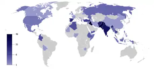 A map representing the number of terrorist incidents occurring across the world in 2008. The map shows that Iraq and Pakistan saw the greatest number of attacks