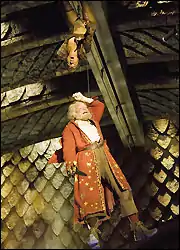The inverted fight between Rincewind and Liessa in the Wyrmberg, by contrast, was the most meticulously choreographed sequence in the film.[12] In addition to the need to add CGI backdrops to every shot, hanging upside down from wires whilst fighting proved to be what David Jason described as "a nauseous experience".[13] The sequence had to be filmed in very short bursts as "all of the actors and stunt people could only manage around four to five minutes before they wanted to [vomit]".[13] Karen David, who played Liessa, pulled several stomach muscles during the filming,[14] and Jason described the experience as like "being hung upside-down like the last chicken at Sainsbury's... I wouldn't do that again in a hurry".[15]