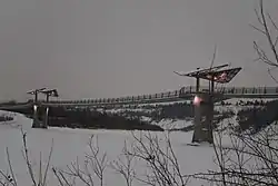 The Terwillegar Park Footbridge is a pedestrian bridge that crosses the North Saskatchewan River in Edmonton, Alberta, Canada. At 262 metres (860 feet) in length, it is the longest stressed ribbon bridge in Canada and second longest in the world after the David Kreitzer Lake Hodges Bicycle Pedestrian Bridge in Escondido, California, United States.[1] The bridge is a first for the city and was built to connect Terwillegar Park in the southern side with Oleskiw River Valley Park on the north side of the river. It opened to the public on October 21, 2016.[2]