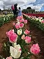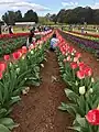 TheTesselaar Tulip Festival is held in Silvan, Victoria every spring, displaying more than 120 varieties of tulips are shown on a 55-acre farm.[1][2] This tulip farm was initiated by a couple of Dutch immigrants, Cees and Johanna Tesselaar. They arrived in Melbourne in 1939 and started to grow tulips, gladioli and daffodils on their land. After purchasing more land in Silvan, they grew more tulip bulbs, which attracted people to stop by on their property and admire their fields. In 1954, the Tesselaars open the farm to the public, with a coin donation for the Australian Red Cross. In 2017, around 900,000 tulip bulbs were planted using modern machinery, and 80,000 bulbs are still planted traditionally by hand.[3][4] The tulip festival has evolved to include music, food and wine festival to attract more visitors during the spring season (September - October).[5]