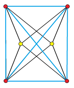 ![]() Orthogonal projection. 4 red vertices and 6 blue edges make central tetrahedron. 2 yellow vertices are bipyramid apexes. | ||