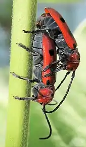 These beetles feed by opening veins in the milkweed plant, decreasing the beetles' exposure to latex-like sap.[6] When startled, the beetles make a shrill noise, while they make a 'purring' noise when interacting with another beetle.[6] The red and black coloring are aposematic, advertising the beetles' inedibility. Red milkweed beetles lay egg-clutches in mid-summer inside the stem base of the milkweed plant.[7]