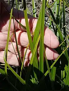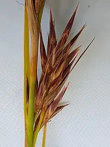 This is a pioneer plant which recovers rapidly after fire, aiding the regrowth of other species. It reaches some 2,5 m in height, is trigonous with wiry, drooping yellow-green leaves that are narrowly sword-shaped and keeled. They have scabrid leaf margins armed with minute teeth pointing to the leaf apex. [5] The flowering stems are erect and triangular in cross-section, standing well above the leaves. Nutlets are small and trigonous, often crowned by a persistent style, and are consumed by the Chacma baboon.